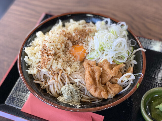 岐阜市にあるうどん店の堀川さんが手掛けるお店。 食券を店員さんに渡すと、テーブル席に着いて、テーブル番号で呼ばれるので、カウンターまで取りに行きます。 そばは、コシがあり、大盛りにしなくてもボリューム満点。 甘い小さな揚げ、ねぎ、ごま、天かすにとろろ昆布が乗っていて、別皿にワサビが付いています。 とろろ昆布をよく混ぜて食べてくださいとの事。 つゆは、思ったより量が多くて、うれしいですね。混ぜやすいです。甘辛くて濃厚で美味しいです。 ごまと昆布の味が効いています。 地元テレビでも何回か取り上げられ、土日は、行列が出来ています。