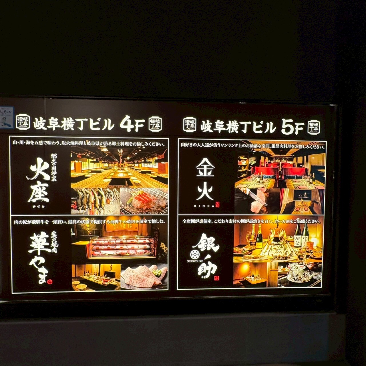 岐阜駅すぐ。 居酒屋で活気づく玉宮のど真ん中に個性溢れる飲食店が集結したグルメ横丁「岐阜横丁」。 海鮮料理・肉料理・焼肉・中華・洋食・鍋料理など、多彩なグルメが一度に楽しめます。 岐阜が誇る「飛騨牛」「日本酒」はもちろん、自然豊かな岐阜で育った野菜や、鶏ちゃん焼き・朴葉味噌焼き・鮎の塩焼きなど、料理人こだわりの岐阜郷土料理も幅広くご用意しています。
