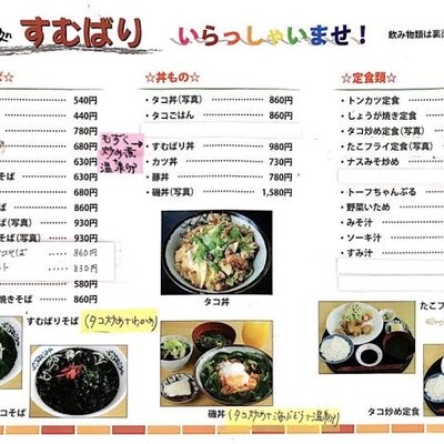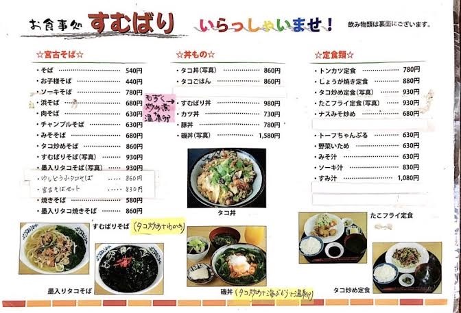 「すむばり」とはお店周辺の地名のこと。宮古島で有名店なタコ料理のお店で、ひっきりなしに訪れるお客さんは若い旅行グループからご近所の常連さんまで様々。名物は地場の蛸を使った料理の数々。宮古島は島ダコがとっても美味しい。イカスミならぬタコスミが食べられ、タコスミはダシがきいていておいしい。オススメはすむばり丼(もずくとたこの炒め丼)900円。