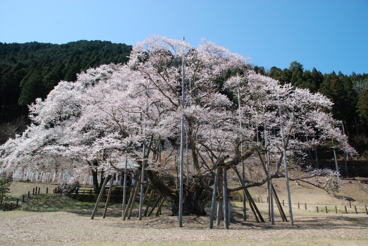 樹高17.3m、幹回9.4mの大木は、山梨県の「山高神代桜」と福島県「三春滝桜」と並んで日本三大桜のひとつに数えられ、国の天然記念物に指定されています。