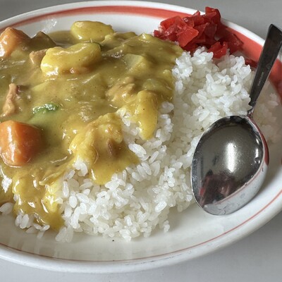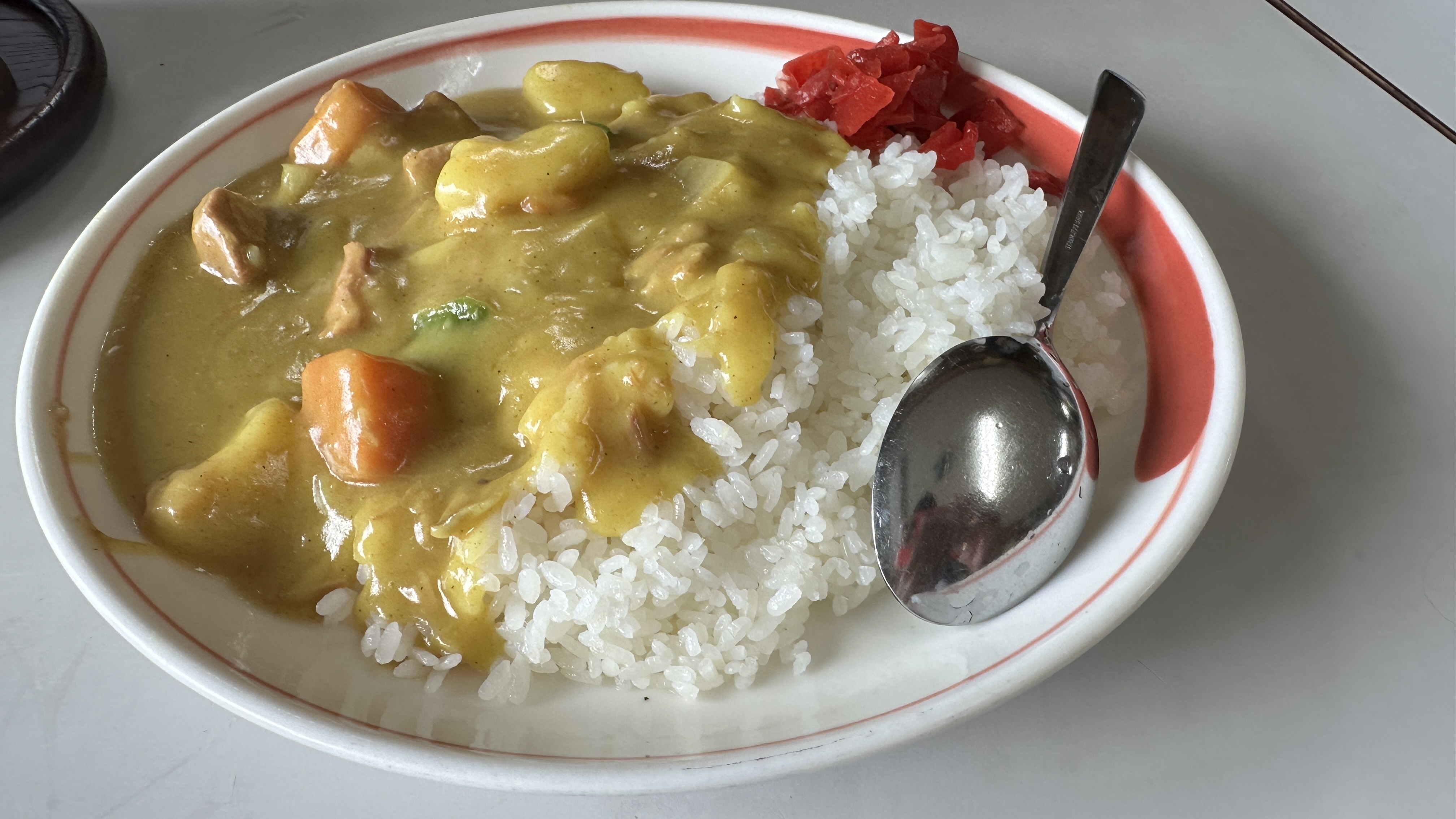 菊栄食堂のカレーは小麦粉とカレー粉で作る昔ながらの黄色いカレーです!野菜もたくさん入っています。