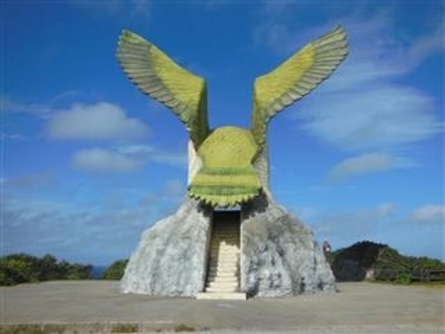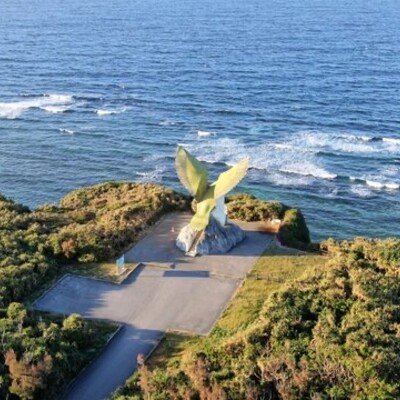 一度聞いただけではその名を覚えるのがむずかしいフナウサギバナタ展望台。フナウサギバナタとは、島の方言で「船を見送る岬」という意味だ。秋になると伊良部島に渡ってくる「サシバ」の形をした展望台は、断崖絶壁で海に向かって翼を広げる巨大なサシバの姿が印象的。かつて沖縄本島に向け船を出す家族を見守った人々の姿に重ねている。