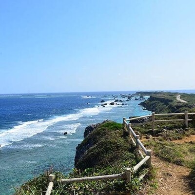 東平安名崎がまさに「一望」できる数少ない場所。岬全景が望めるのはもしかするとここだけかも?県道からの東平安名崎入口から岬方向へ向かってすぐにある左への道に入り、坂を上っていくとあります。展望台入口には無人の飲み物販売コーナーがありますが、見晴台は無料です。入ってすぐにベンチがありますが、そこからは景色は望めません。その先にある手摺りの所、まさに絶景。東平安名崎全体が望めるのはもちろんのこと、細い岬の左右の海も望めます。まさに東平安名崎の細さを実感できる場所です。