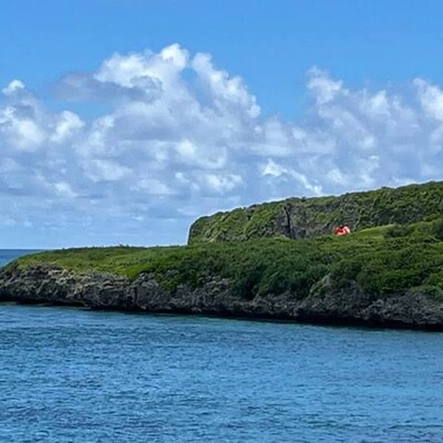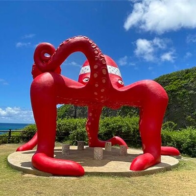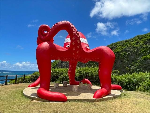来間島南東の崖上にあるタコのモニュメントの展望台。雄大な海と切り立った断崖のダイナミックな風景を見ることができる。展望台までは遊歩道が通っていて、所要時間は徒歩約10分ほど。周囲にはトイレ、売店などの施設はない。遊歩道を抜けるといっきに視界がひらけ、小高い丘の上にタコの姿が見える。坂道を登りながら後ろを振り返ると切り立った断崖絶壁のダイナミックな風景が目に入る。丘に登る手前の空き地をそのまままっすぐ行くと小さな浜があります。